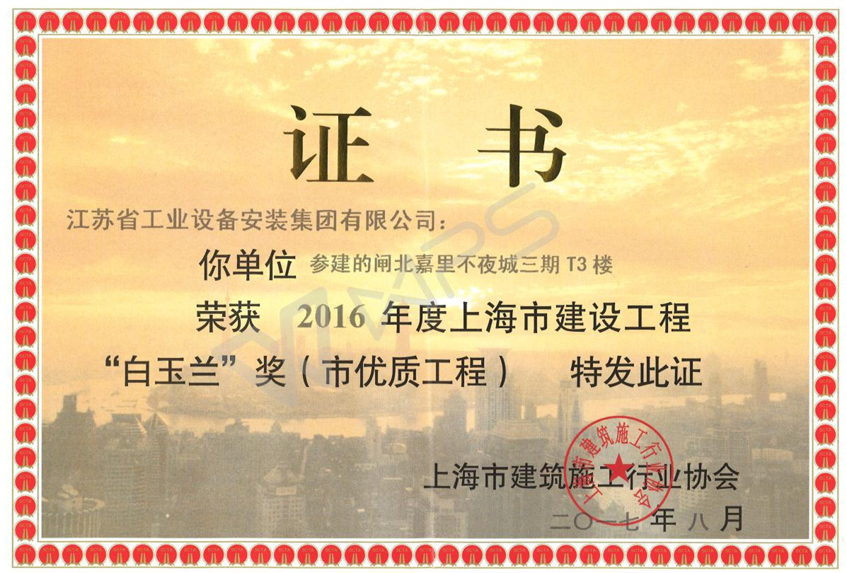 2016年12月,开云手机站登录入口通旺分公司参建的上海闸北嘉里不夜城三期T3楼项目成功入选上海市建设工程“白玉兰”奖(市优质工程),该工程经过一冬一夏的使用考验,无质量问题,2017年8月正式颁奖予以表彰。