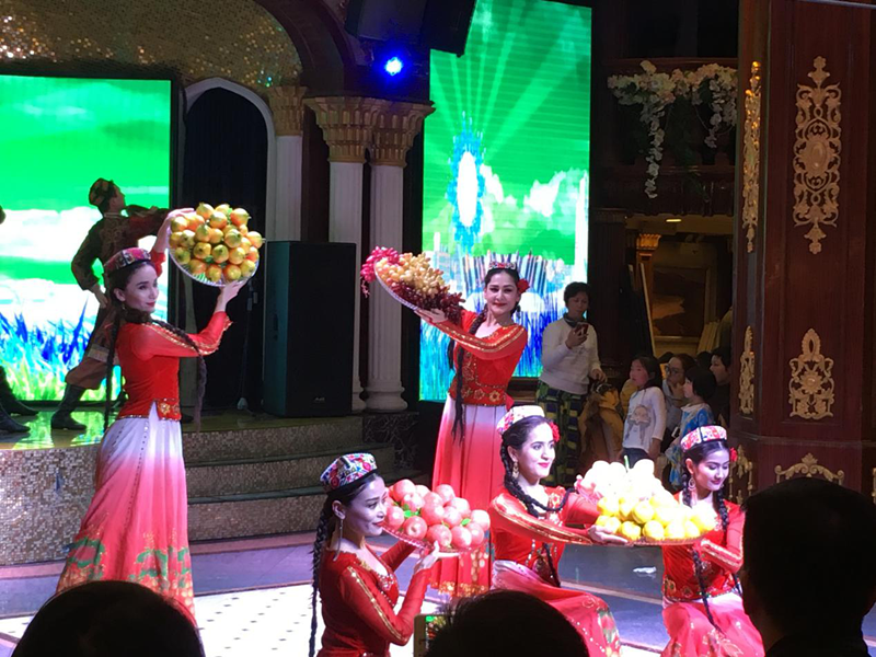 酒店的餐厅和饮食颇有特色,每天吸引了众多食客来此用餐。给我印象深刻的是,在这里入住,不仅可以品尝正宗的新疆美食,还能免费欣赏到充满民族风情的歌舞表演。维吾尔族能歌善舞,维族美女婀娜多姿,的确名不虚传。头戴小花帽的男主持人语言幽默,擅长与客人互动,在感染力极强的维族音乐声中,常能激发客人的跳舞欲望,再与维族演员手拉手共舞,现场气氛掀起阵阵高潮。